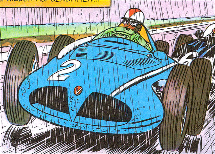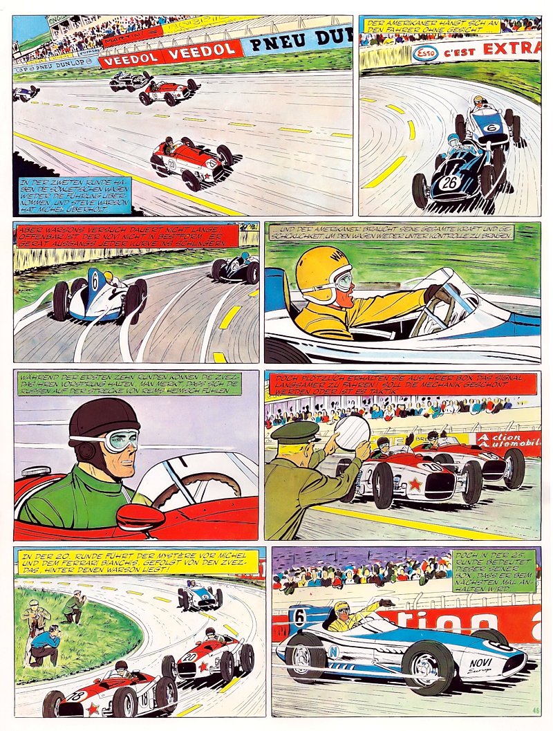 Als echte Besonderheit startet die deutsche Neuauflage des Mosaik-Verlags mit einer vorher in Deutschland nie gezeigten Seite aus Tintin Nr. 53 von 1958, die die Hochzeit von Jean-Pierre und Agnes thematisiert. Für Jean Graton war die Darstellung der Familienumgebung unseres Helden genau so wichtig, wie die sportliche Seite! Außerdem werden die Fans auch in diesem zweiten Band wieder mit drei redaktionellen Seiten verwöhnt, die nicht nur umfassende Infos zum Album liefern, sondern obendrein als Schmankerl das zweiseitige Crossover mit Jari und Jimmy Torrent in deutsch zeigen. |