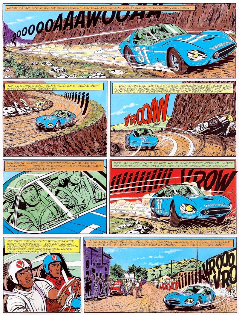 Henri Vaillant schickt ein "Kommando" über den großen Teich, um die US-Pisten zu erobern, kann aber nicht ahnen, dass Steve zum Verräter wird. Warsons Verrat bietet interessante Impressionen von Steves Farm und Ranch. Cramers technischer K.O. auf Seite 60 macht Laune. In diesem Album wendet Graton zur Spannungssteigerung erstmals ein dramaturgisches Hilfsmittel an, das er danach alle 15 Jahre variieren wird: Steve verschwindet unter mysteriösen Umständen und bleibt einige Alben lang abwesend. |