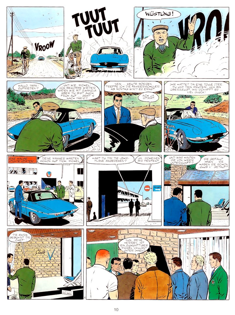 Michel trainiert eine Mannschaft begabter Nachwuchspiloten, in deren Reihen es zu Streit kommt, als ein Russe - Der 8. Fahrer - und ein Amerikaner aufeinandertreffen. Der Russe wirkt in seinen erzieherischen Absichten etwas veraltet, bietet aber solide Vaillant-Unterhaltung im ausgereiften Graton-Stil der frühen 60er. Das Album überzeugt vor allem in den liebevoll gestalteten Rallye-Szenen, deren detailliert recherchierte Hintergründe eine äußerst authentische Atmosphäre vermitteln. Cool: der Club V - ein Vorläufer der berühmten Rennfahrerschule "La Filière ELF", die erst 1997 gegründet werden sollte! |