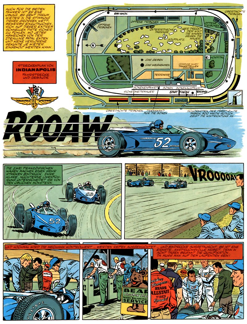 Dieses Album eröffnet mit einem Ford Mustang, der zur Teststrecke der Texas Drivers röhrt. Das Wiedersehen mit den niederträchtigen Mitgliedern dieses Teams garantiert Spannung in Indianapolis, wenn die Vaillante-Boliden sich behaupten wollen. G-Man McGrath entwickelt einen riskanten Plan, um die Pistensäue zu stoppen. Die graphische Brillanz dieses Renn-Albums zeigt sich in einigen atemberaubend gut illustrierten Sequenzen wie z.B. dem Brand in der Vaillant-Fabrik. In diesem prachtvollen, ausgereiften Stil wird Graton auch noch die beiden nächsten Alben gestalten. |
