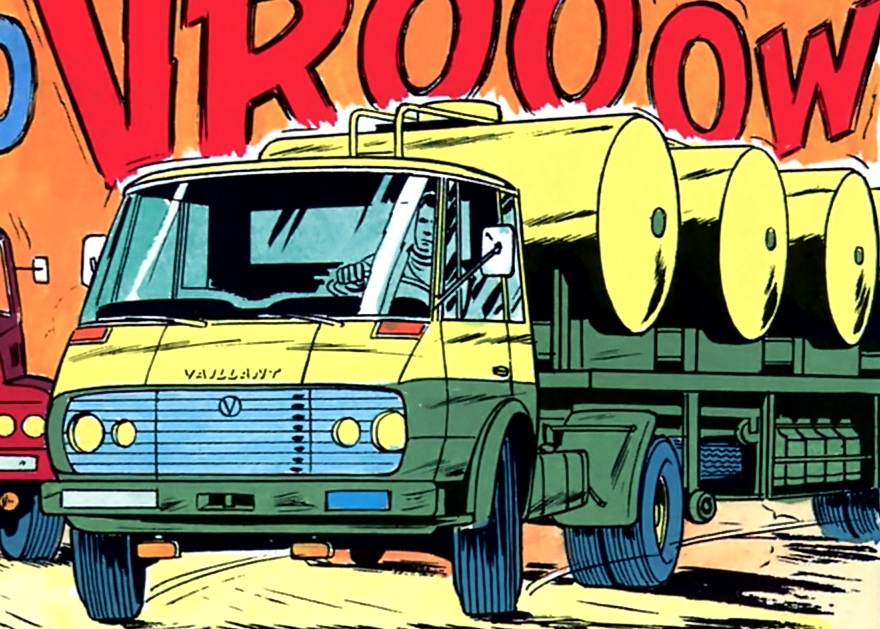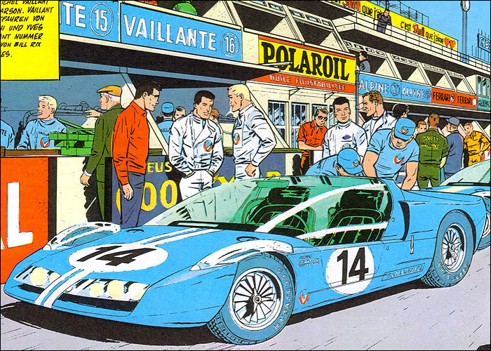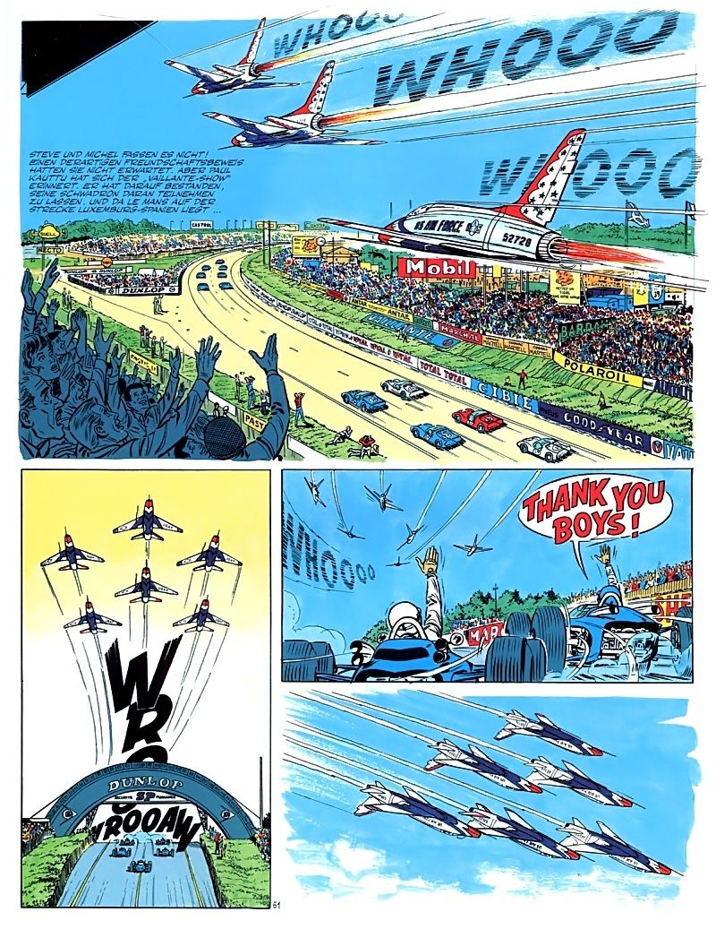 Steve, Michel und einige US-Jet-Piloten bewähren sich bei zwei Mutproben und als Brandhelfer in einer Fabrik. Die spektakuläre, von einem Flammenmeer beleuchtete Szenerie wirkt bestechend realistisch, der klassische Vaillant-Stil, lebendiger und detaillierter denn je, ist in endgültiger Perfektion zu bewundern. Konzert der Piloten erzählt in überzeugender Weise vom echten und falschen Heldentum und ist ein exquisiter Klassiker für Freunde der frankobelgischen Comickultur (und schließt die Ära der epischen 62-Seiten-Alben ab). |