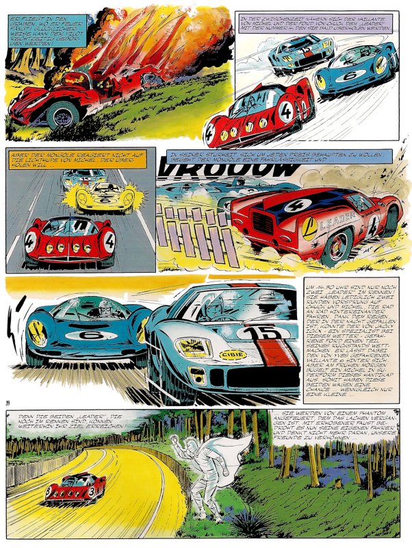 Als Das Phantom der 24 Stunden von Le Mans wirft sich der Leader in ein modisches Mumien-Kostüm und lädt zur Mitternachtsaudienz auf der Haupttribüne von Le Mans. Bald darauf hetzen Mongolen in aggressiven Leader-Boliden die Vaillantes über die Piste. Graton hält das spannende Renngeschehen in dramatischen Panels fest, und Michels spektakuläre Action-Einlage auf der Haupttribüne läßt uns den Atem stocken. Ein faszinierender Le-Mans-Klassiker, der die Rennatmosphäre brillant einfängt und sicherlich zu den populärsten Vaillant-Abenteuern zählt. |