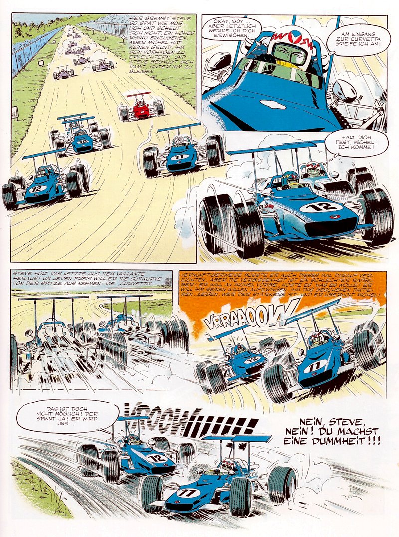 Wenn die gesunde Konkurrenz der Formel-1-Fahrer durch Neid und Mißgunst vergiftet wird, ist "Öl auf der Piste". Öl auf der Piste heißt dann auch dieses Vaillant-Album aus den späten 60er Jahren, in dem Steve Warson zum Charakterschwein mutiert. Schuld hat: eine Blondine. Michel wird in seinen bislang spektakulärsten Crash verwickelt, und Jacky Ickx darf eine tragende Hauptrolle spielen. Dieses schöne MV-Album zeigt die ersten gespoilerten F1-Boliden von Vaillante. Besonders reizvoll: die hochdetaillierten Bilder vom Mailänder Dom. |