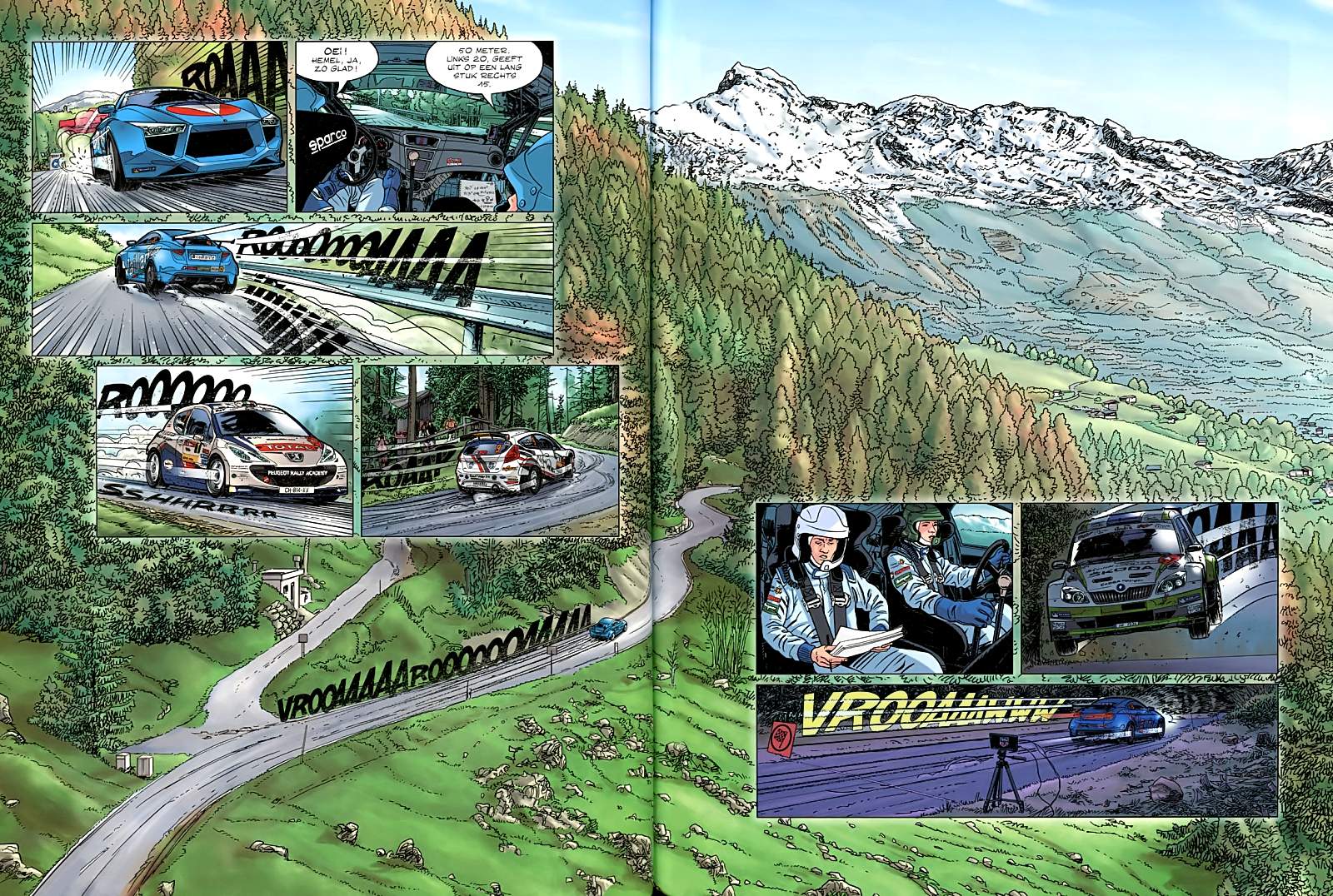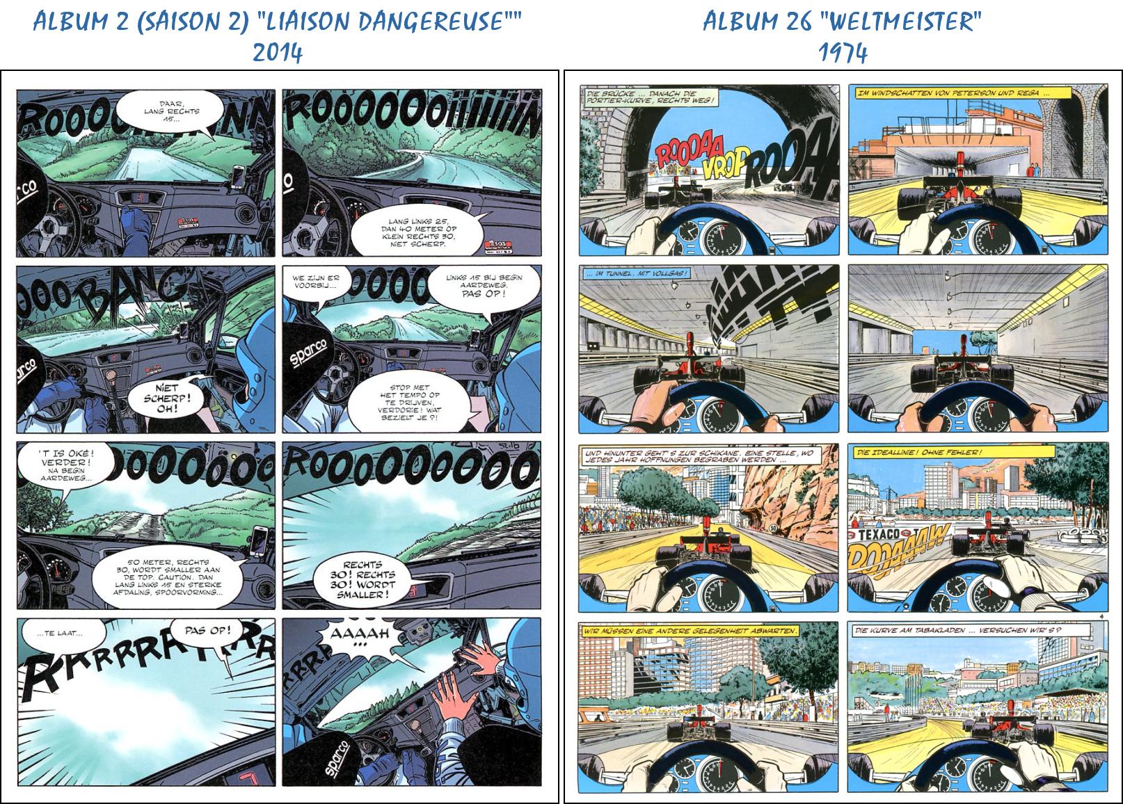 Das dritte Album der neuen Saison Gefährliche Liebschaft führt uns ins schweizerische Wallis. Michel nimmt an der Rallye International du Valais (RIV) teil. Es beginnt mit spannenden Szenen aus dem Cockpit seines Rallyewagens und erinnert sofort an ähnliche Auftakt-Bilder aus A26 - Weltmeister (siehe Vergleich). Ein rasantes Rallye-Album mit dynamisch gezeichneten Rallyeszenen in spektakulärer Landschaft. Nett: Wiederaufnahme des Running-Gags mit Henri und dem Fahrrad in überraschender neuer Version! |