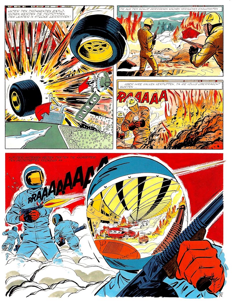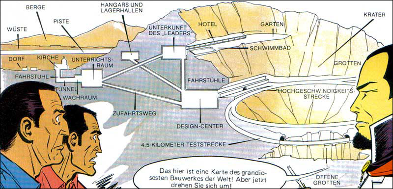 In einem knallroten Mercury Cougar Eliminator rasen Cramer und Hawkins zur Leader-Zentrale im mexikanischen Hochland - hinein in ein episches 88-Seiten-Abenteuer, das Jean Graton auf zwei hochklassige Alben verteilt. In Schlacht um einen Motor ist dem Leader jedes Mittel recht, um Vaillante die Teilnahme an der Panamerica zu versauen, während Steve, Michel und Jean-Pierre in Dearborn den Bau der neuen Boliden überwachen. Klasse: die unterirdische Kommandozentrale des Leaders mit der Einschienenbahn. Fortsetzung in A22. |