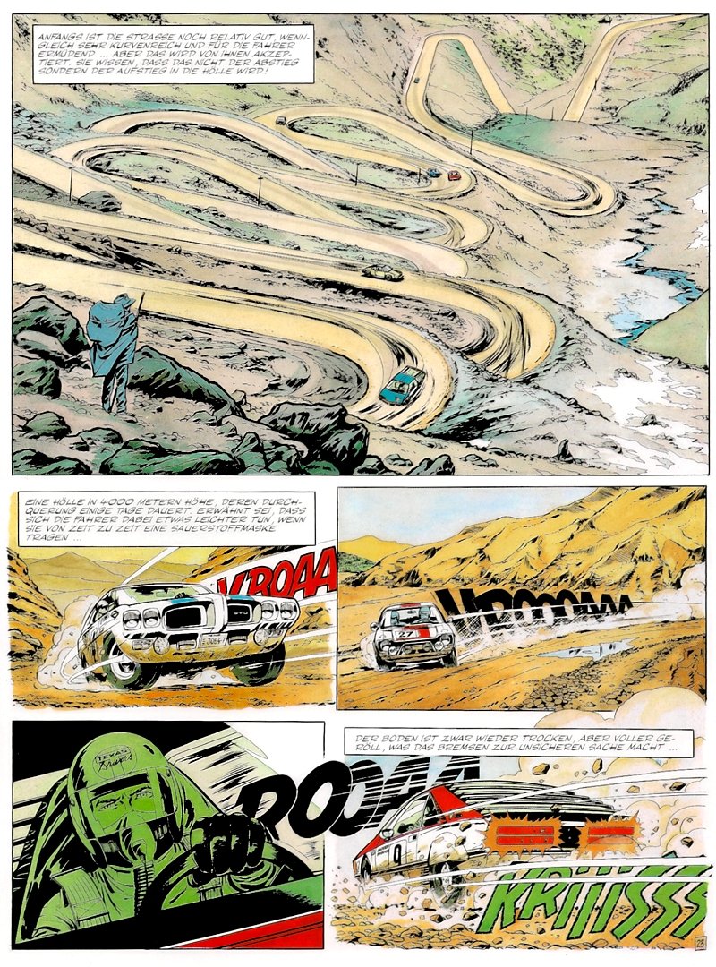 Mit Rush legte Graton eines der besten Alben vor. Die prachtvoll gestalteten Landschaften bilden den Background für eine spannende Hetzjagd quer über den amerikanischen Kontinent. Dass die Leader-Piloten die Konkurrenz mit der schweren Wumme aus dem Weg räumen, sorgt für eine neue Qualität in der sportlichen Auseinandersetzung. Michel und Steve pilotieren derweil den futuristisch designten Superflitzer Rush. Durch seine atmosphärische Dichte und die dramatisch zugespitzte Rallye-Handlung wird dieses Album zum Klassiker. |
