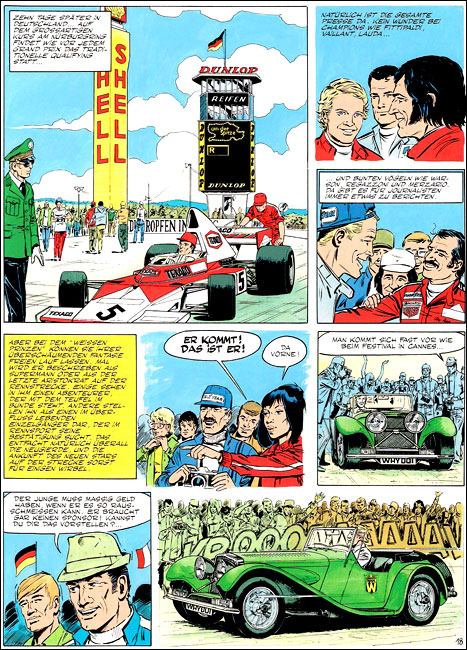 Sir Douglas Whyte, ein englischer Gentlemen-Driver, deklassiert mit seinem selbst konstruierten Formel-1-Boliden die etablierten Champions. Henri ist der Ansicht, Der weiße Prinz sei mit einem frisierten Motor unterwegs. Mit dieser routiniert ausgeführten Geschichte, die von langen Rennsequenzen geprägt wird, verabschiedete sich Jean Graton vom Verlag Lombard (chronologisch ist die Story vor A28 einzusortieren). Überraschenderweise kommentiert Graton im letzten Panel das "unmoralische" Ende der Geschichte. |