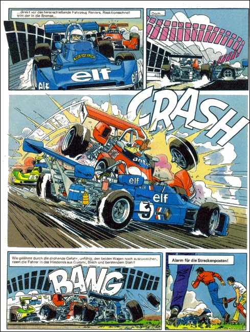Die jungen Wölfe ist das erste der drei Alben, die beim Dargaud-Verlag erschienen. Ehrgeizige Nachwuchsfahrer, darunter der Neffe eines Mafia-Paten und der Bruder von Steves Freundin, bekämpfen sich bis aufs Blut, um in die Formel 1 aufzusteigen. Mit diesem Album und der Fortsetzung A32 thematisierte Graton deutlicher als je zuvor und danach, dass Steve und Michel in die Jahre gekommen waren. Ob er auf ein mögliches Ende der Serie hinarbeiten wollte? Übrigens hat das blonde Boxenluder Steve hier immerhin fünf Freundinnen.