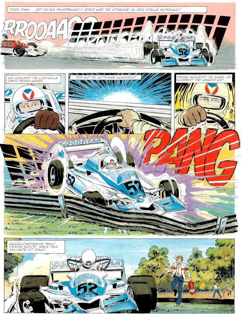 Nach zwei Jahrzehnten gönnte Jean Graton dem unermüdlichen Jean-Pierre die Hauptrolle in einem Vaillant-Album - und porträtierte ihn als Workaholic im Dauerstress, der sein Leben für die Formel 1 opfert. Um den desertierten Steve zu ersetzen, muss er unerfahrene Ersatzpiloten ins Vaillante-Cockpit setzen. Mit diesem Album verabschieden sich Patrick und Jean-Michel Vaillant aus dem MV-Universum - die beiden Sprößlinge tauchen erst in A65 wieder auf. Die Zeichner des Studio Graton werden auf der letzten Seite als Galeerensklaven dargestellt. |