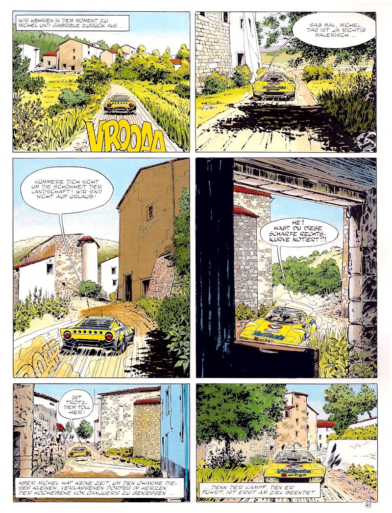Nach zwei Jahren Abwesenheit meldet sich Steve Warson als bärtiger Hippie zurück zum Dienst. Bei der "Rallye der 1000 Pisten", die auf einem Übungsgelände des französischen Militärs in Südfrankreich stattfindet, fordert er Michel Vaillant zu einem Fahrerduell. Das vierte Rallye-Album der Serie ist in einem eindrucksvoll öden Landstrich angesiedelt.