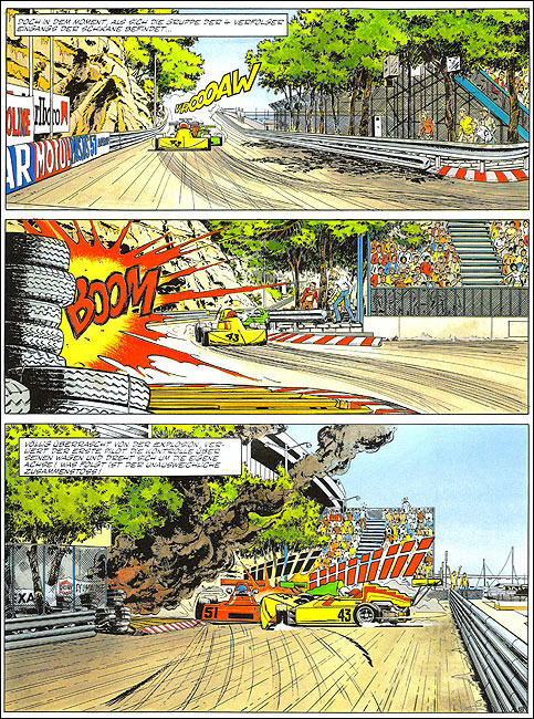 Während des Grand Prix von Monaco setzt ein anonymer Erpresser die Rennleitung unter Druck. Um seine Geldforderung durchzusetzen, zündet er zwei Bomben am Streckenrand. Damit die Panik in Monaco ein Ende findet, wagt Michel Vaillant über der Bucht von Monte Carlo einen Helikopter-Stunt vom Feinsten. In keinem anderen MV-Album gibt es so viele prachtvolle Zeichnungen von Monaco zu bewundern. Raymondo, der falsche Kommissar, scheint ein enger Verwandter der legendären "Cousine" Betty zu sein. |