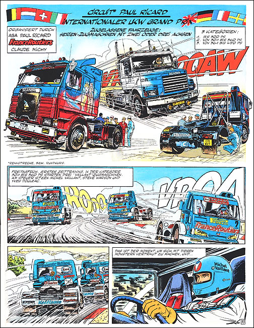 Als ein LKW von Benjamin Vaillant gestohlen wird, setzen sich Yves und Gabriele auf die Spur der Diebe. Obwohl ihm die Gangster schwer zusetzen, taucht Yves rechtzeitig in Paul Ricard auf, um zusammen mit Steve und Michel an einem Lastwagenrennen teilzunehmen. Schwere Kaliber ist, 27 Jahre nach A4, das zweite Lastwagen-Album der Serie. Nach fast drei Jahrzehnten wilder Ehe geben Benjamin Vaillant und Madame Douleac hier ihre Heirat bekannt, und Henri materialisiert überraschenderweise als "Pilot ohne Gesicht". |