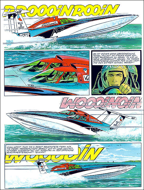 Mit dem thematisch ungewöhnlichen Album Die Nacht von Carnac startete Jean Graton in ein neues Vaillant-Jahrzehnt. Michel, der mit einem riesigen Speedboot beim Offshore Grand Prix von Brest teilnimmt, wird mit einer lokalen Legende aus napoleonischer Zeit konfrontiert. Das Studio Graton beweist hier in den historischen Rückblenden und bei der graphischen Darstellung der Menhir-Felder von Carnac besondere Qualitäten. Und wie immer, wenn MV ins feuchte Element ausweicht, ist auch Paul Victor mit dabei (A2, K16). |