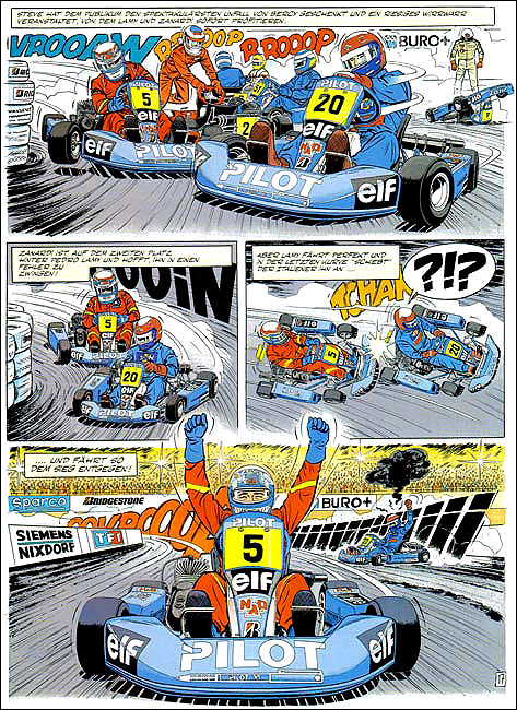 Nach dem Ende der Formel-1-Saison treffen sich die Piloten zu einem Kart-Rennen in Bercy (einem Stadtteil von Paris). Ein bewaffneter Computer-Nerd entwendet die hochmoderne Software, mit der die Rennzeiten gemessen werden. In Das Fieber von Bercy sehen wir Michel Vaillant erstmals als Kart-Piloten - der sich gleich eine zünftige Verfolgungsjagd durch die Straßen von Paris liefert. Nerd Billy darf hier die Gesichtszüge von Bill Gates auftragen, während die Chinesin May mit den großkalibrigen Waffen einer Frau agiert. Fortsetzung in A62. |