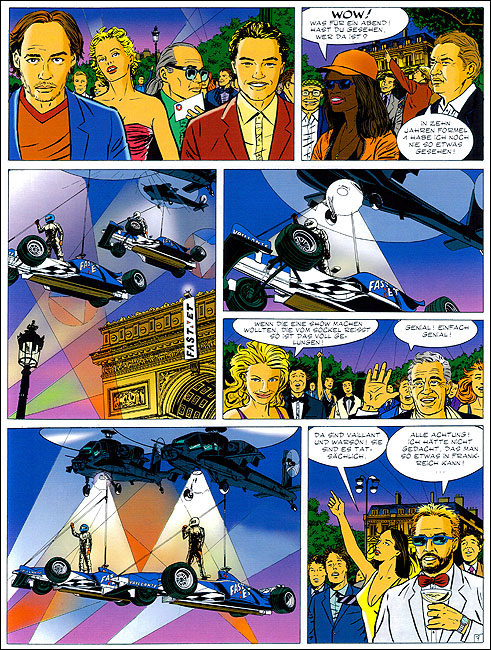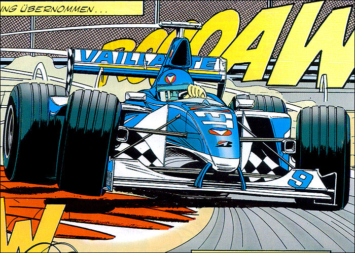 Fastnet, der neue Sponsor des Vaillant-Teams (siehe auch A61), entpuppt sich als mafiöses Unternehmen. Während Steve und Michel in Monza starten, bläst DER $PON$OR zur Attacke auf die Jonquiere. Mit diesem Album rückt erstmals die Jonquiere als Handlungsort ins Zentrum des Geschehens - dies gibt Henri Gelegenheit, sich souverän als Heimatschützer zu profilieren. Steve Warson kehrt außerdem als Formel-1-Fahrer zu Vaillante zurück. Und: Wir haben 37 Jahre nach A7 mal wieder die Gelegenheit, einen Vaillante-Traktor zu sehen. |