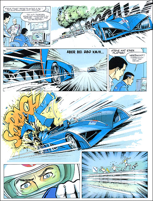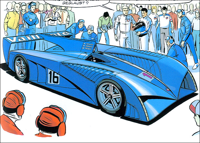 Le Mans. Der 19jährige Dylan Montusset startet als Co-Pilot von Steve und Michel. Sein Vater, ein bankrotter Geschäftsmann, setzt den jungen Fahrer 24 Stunden unter Druck. 46 Jahre nach der Pisten- und Pillensau Bob Cramer (A5) sorgt mit Dylan Montusset mal wieder ein (hier unwissentlich) gedopter Pilot für Stimmung in Le Mans. Das Studio Graton scheint mit diesem soliden Renn-Album seine Blaue Periode zu durchlaufen. Ob der junge Dylan zu einem neuen Protagonisten im Vaillant-Kosmos aufgebaut werden soll, wird sich zeigen. |