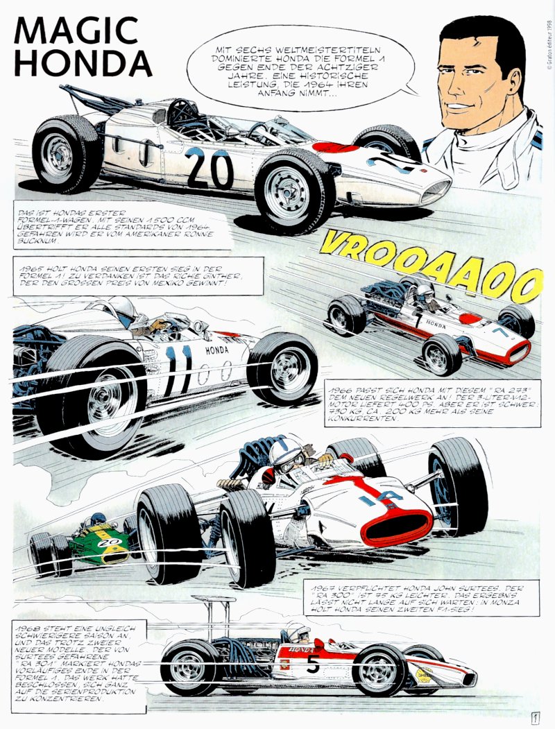 1948 begann Honda zunächst mit der Produktion von Motoren zum Antrieb von Fahrrädern, produzierte aber auch bald schon Motorräder und entwickelte sich innerhalb weniger Jahre zum Marktführer. 1962 begann die Automobilproduktion mit dem kleinen britisch anmutenden Sportwagen S500 und dem Kleintransporter T360. Da Soichiro Honda selbst ein großer Rennsportfan war, wurde 1964 ein eigenes Formel 1 Team gegründet. All dies und natürlich auch die weitere Historie mit 5 Fahrer- und 6 Kontrukteurstiteln mit Williams und McLaren in der Formel 1 Weltmeisterschaft erfahren wir in diesem Dossier!