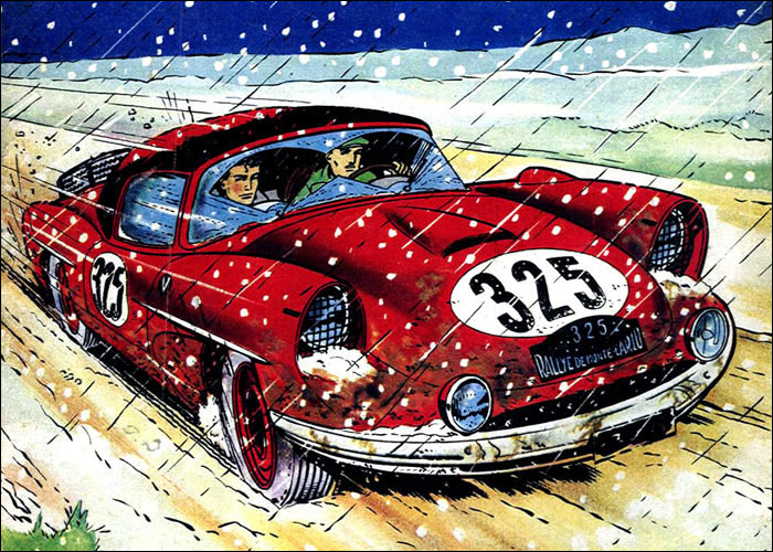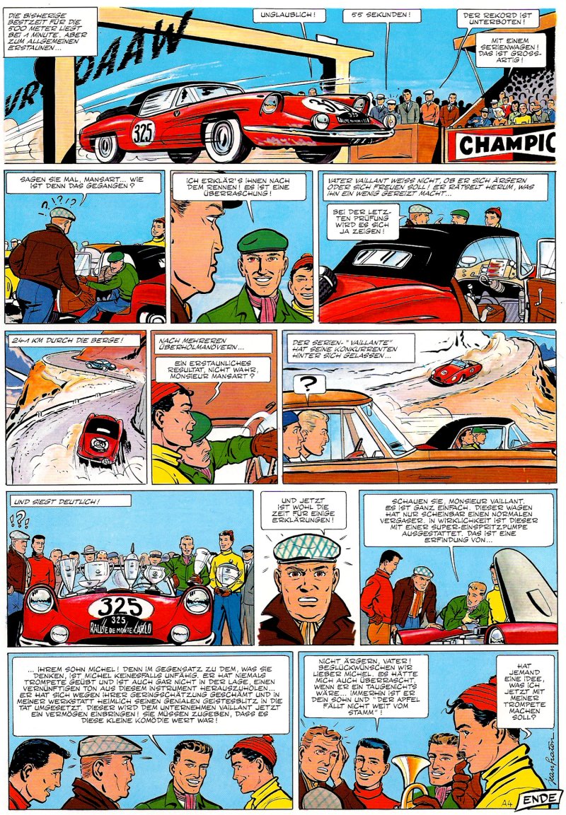 Mit Der Apfel fällt nicht weit vom Stamm feierte Michel Vaillant sein Comic-Debüt. Der junge Champion startet als Co-Pilot bei der Rallye Monte Carlo, die ihn von Stockholm über Paris nach Monaco führt. Interessanterweise wird MV in dieser Geschichte noch als pubertärer Kindskopf porträtiert, der Vater Vaillant mit einer Trompete nervt. Henri selbst ist hier noch als Fahrer unterwegs und bestreitet die Rallye mit Jean-Pierre (er wird sich erst in A48 wieder hinter ein Volant klemmen). Ob der Clan hier bereits auf der Jonquiere wohnt, ist nicht eindeutig ermittelbar. |