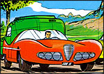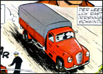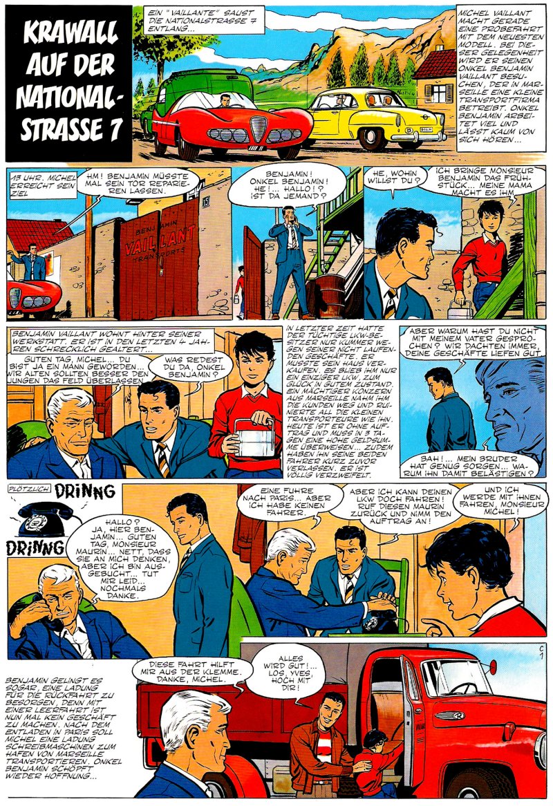In Krawall auf der Nationalstraße 7 begegnen wir Michels Onkel Benjamin Vaillant, der in Marseille ein Fuhrunternehmen betreibt. Yves Douleac tritt als Knirps von ungefähr 11 Jahren in Erscheinung, und Michel sehen wir erstmals am Steuer eines LKW. Dieser hübsche 4-Seiter, in dem MV zwei betrügerische Trucker überführt, ist sozusagen die Ouvertüre zum großen Fernfahreralbum A4, in dem Yves und Benjamin drei Jahre später erneut tragende Rollen übernehmen. Zünftig: die Prügelei auf der Landstraße. |