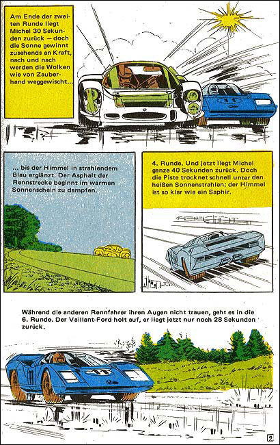 Die letzte Vaillant-Geschichte der 60er Jahre zeigt in stimmungsvollen Bildern den verregneten Nürburgring, wo Steve und Michel auf ihren Vaillante-Fords zum 1000-Kilometer-Rennen starten. Vier Jahre nach A12 ist MV also wieder in der Eifel zu Gast und spielt dort in überraschender Weise den Wetterfrosch, was Jean-Pierre fast zur Verzweiflung treibt. In Duell im Regen verweisen die kantigen Prototypen (die sich deutlich von den rundlichen Vorjahresfahrzeugen unterscheiden) designtechnisch auf die nahen 70er Jahre. |