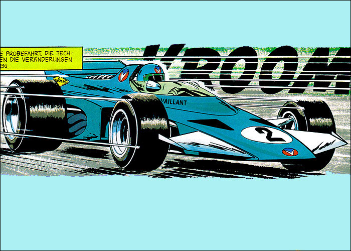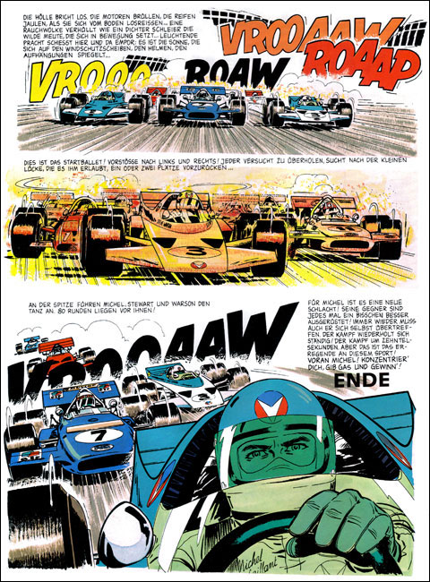 Eine hübsche Impression aus der Formel 1-Welt der frühen 70er Jahre: Weil MV's Bolide in Brands Hatch nicht die erhoffte Leistung bringt, suchen Jean-Pierre und seine Mechaniker verzweifelt nach Optimierungsmöglichkeiten. Doch beim Qualifying liegt Jackie Stewart eine Zehntelsekunde vor Michel. Kampf um 1/10 Sekunden bietet sieben Seiten im souveränen Vaillant-Stil der frühen 70er Jahre und schließt mit einem Open End ab. Die Geschichte blendet zurück in eine Zeit, in der noch nicht um 100stel oder gar 1000stel Sekunden gekämpft wurde.