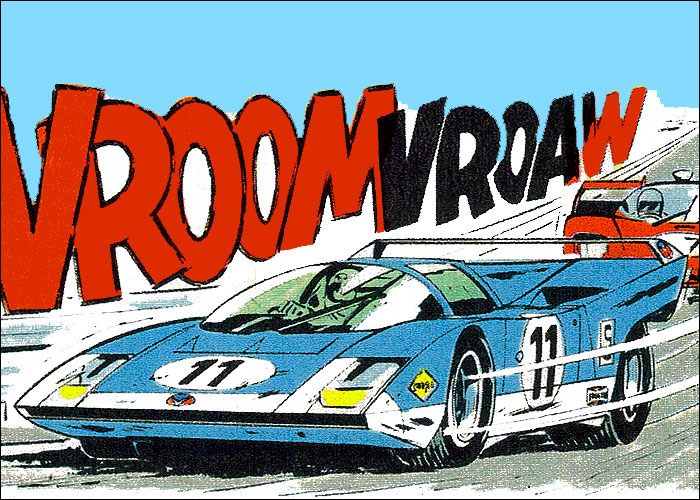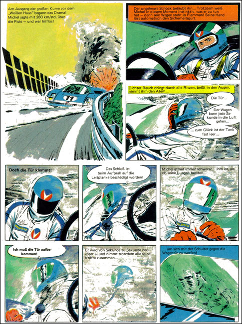Bei den 24 Stunden von Le Mans landet Michel in der Leitplanke. Erst Francoise kann ihn aus seinem havarierten Prototypen befreien - muss aber feststellen, dass er sich sogar nach einem schweren Crash mehr für das Rennen als für sie interessiert. Mit Ein schwarzer Tag intensiviert Jean Graton die bis dato platonische Beziehung von Michel und der jungen Journalistin Latour - man plant hier sogar gemeinsame Urlaube. Da der klasssische Le Mans-Start 1970 abgeschafft wurde, muss MV hier erstmals nicht in seinen Boliden flanken. |