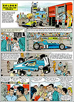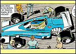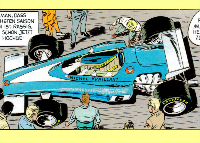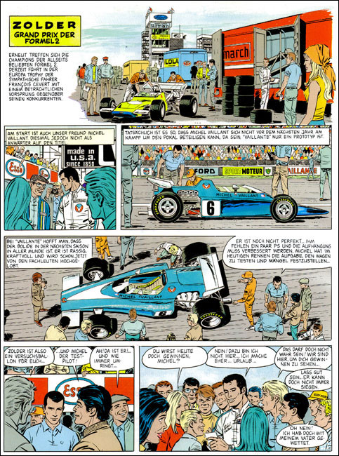 Michel soll beim Formel 2-Rennen in Zolder den neuen Vaillante-Boliden testen. Obwohl Jean-Pierre eine gemächliche Fahrweise anodnet, kämpft sich MV aus der sechsten Startreihe bis auf den ersten Platz vor, um Francoise, die an diesem Tag 25 Jahre alt wird, das Zielbukett zu schenken. Zu dieser Zeit traten F1-Piloten aus finanziellen Gründen auch gerne mal in der Formel 2 an. Francois Cévert, der hier von MV auf der Ziellinie überholt wird, starb zwei Jahre später in Watkins Glen. In K24 outet sich Steve ebenfalls als Blumenfreund. |