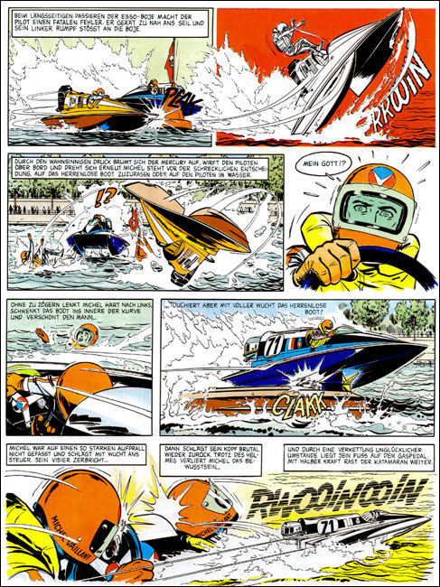 Bei einem Motorboot-Rennen auf der Seine kollidiert Michel mit einem gekenterten Boot und verliert das Bewußtsein. Als sein Katamaran führungslos dahinrast, bringt ihn ein Fahrer durch ein riskantes Manöver wieder unter Kontrolle - es ist Paul Victor, dem Michel in A2 das Leben gerettet hatte. In In der Hölle der 6 Stunden, einer exzellent gezeichneten Kurzgeschichte, treffen wir erneut auf Paul Victor, eine Figur, die Jean Graton nach einem seiner Freunde benannte. Studiozeichner Daniel Bouchez ist hier als Mitautor angegeben. |