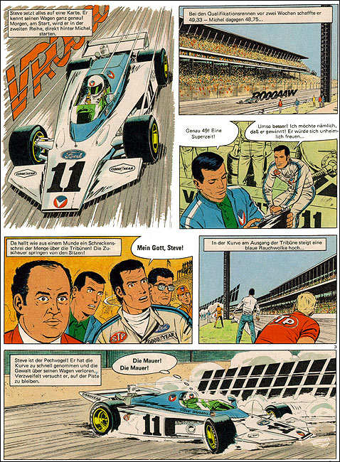 Steve, der unbedingt in Indianapolis siegen will, fährt seinen Boliden im Training zu Schrott. Um seinem Freund einen Gefallen zu tun, täuscht Michel während des Rennens ein Unwohlsein vor und überlässt Steve sein Cockpit - der die 500 Meilen prompt als Sieger beendet. In Du bist dran, Steve kehrte Graton sieben Jahre nach A11 wieder nach Indianapolis zurück. Der von MV geleistete Freundschaftsdienst unterstreicht einmal mehr dessen überragende charakterliche Qualitäten. Zwei Jahre später triumphiert Steve erneut in Indianapolis (A26). |