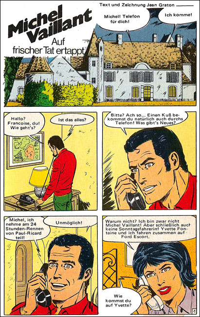 Francoise startet, als Co-Pilotin von Yvette Fontaine auf einem Ford Escort, beim 24-Stunden-Rennen von Paul Ricard. Sie provoziert mit einem gewagten Schleudermanöver eine Panikreaktion bei MV, um dessen Gefühle für sie zu testen - und gibt ihm zu verstehen, dass sie an eine Heirat denkt. Mit der hübschen Kurzgeschichte Auf frischer Tat ertappt bereitete Jean Graton die Leser auf die Hochzeit von Michel und Francoise vor, die dann zwei Jahre später in A25 stattfand. MV ist hier erstmals auf einem Mofa zu sehen. |