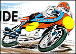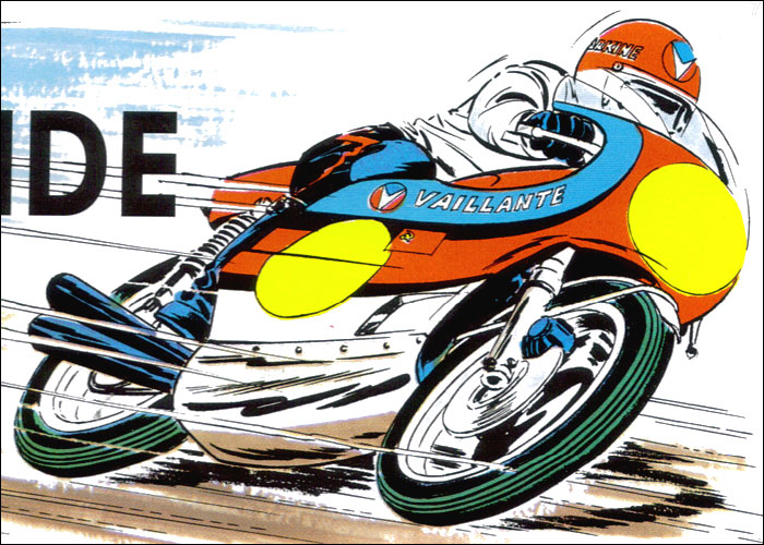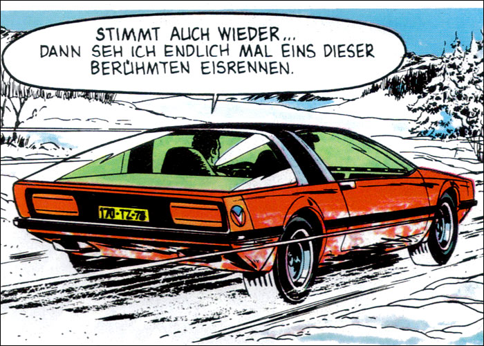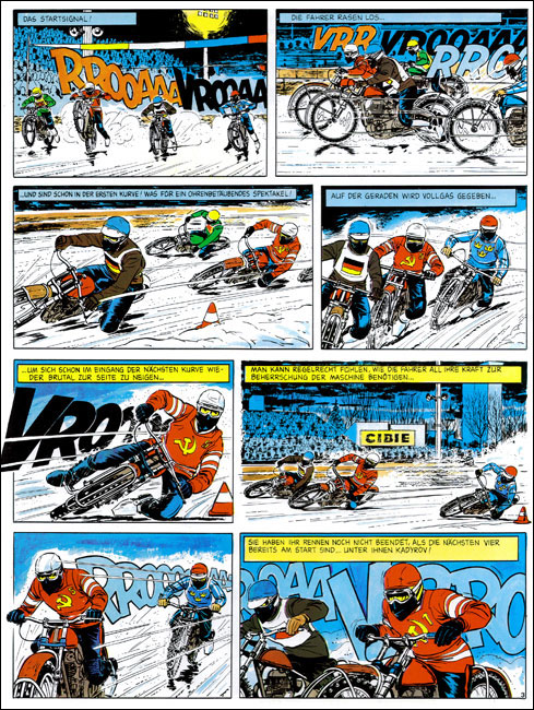 In Sie kamen aus dem Osten treffen wir Michel und Francoise in Grenoble, wo internationale Motorradchamps zum Eisrennen antreten. Der junge Fahrer Alex Narkine entpuppt sich als Sohn des russischen Piloten Nicolas Narkine (A2 - Wettrennen mit einem Phantom). Nach einem schweren Sturz scheidet der junge Russe verletzt aus. Zusammen mit K26 und K27 wurde diese Geschichte im Motorrad-Sonderband "Special Moto" abgedruckt. Alex Narkine treffen wir nach seiner Genesung im nächsten Jahr in W2 wieder. |