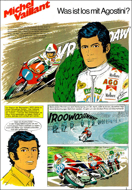 Motorrad-Champ Giacomo Agostini steht im Mittelpunkt dieser Kurzgeschichte, die 1973 im "Special Moto" erschien. Das Ende einer Karriere hat genau genommen keine Handlung, sondern dokumentiert die für Agostini schwierige Rennsaison des Jahres 1972 ("Ago" treffen wir in W2 wieder). Diese Geschichte ist durch die dynamisch gestalteten Motorradsequenzen besonders interessant, bei denen Zweiradspezialist Scott Wood sein ganzes Können zeigen durfte. Michel Vaillant absolviert einen kurzen Gastauftritt im vorletzten Panel. |