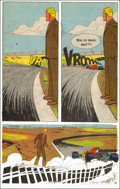 Um dem jungen Piloten Peter die Angst vor Linkskurven zu nehmen (siehe K28 - Ein schwieriger Fall), stellt sich Steve als lebende Streckenmarkierung zur Verfügung. Die Linkskurve wurde von Graton auf der Formel 2-Strecke im belgischen Nivelles angesiedelt, weil sich dort eine besonders unübersichtliche Linkskurve für das sehr spezielle Fahrtraining von Steve und MV anbot. Interessanterweise sehen wir in dieser Geschichte den ersten (und vorerst letzten) Vaillante-Rennwagen in knalligem Ferrari-Rot. |