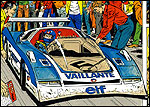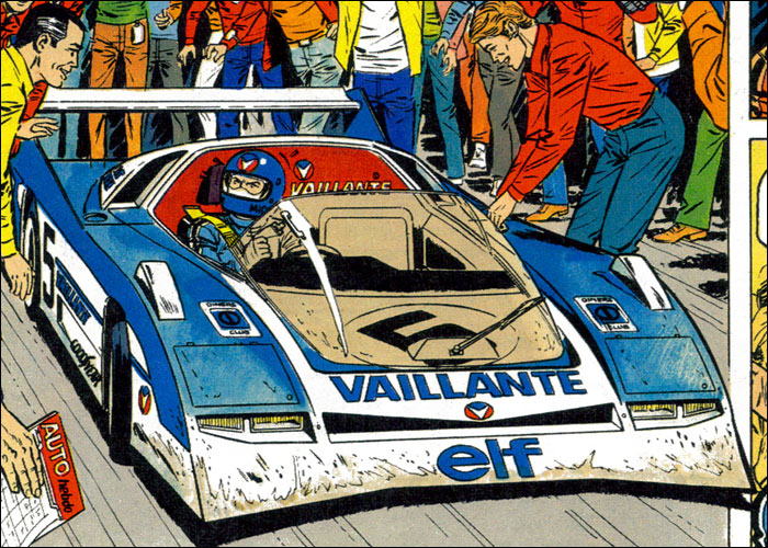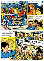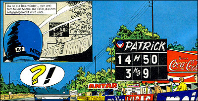 Zum zwanzigsten Seriengeburtstag gönnt Jean Graton seinem Helden Michel Vaillant Das schönste Rennen. Während er bei den 24 Stunden von Le Mans antritt, wird er Vater - was ihm die Box mit einer Anzeigetafel signalisiert. Sohnemann Patrick verschwindet danach allerdings aus dem Vaillant-Epos und wird zu einer Phantomgestalt. 2003 scheint er in A65 als Silhoutte im Garten der Jonquiere wiederaufzutauchen (als 10jähriger Knirps). Vermutlich haben Leserproteste dazu geführt, dass Graton MV nicht als Familienvater präsentieren wollte. |