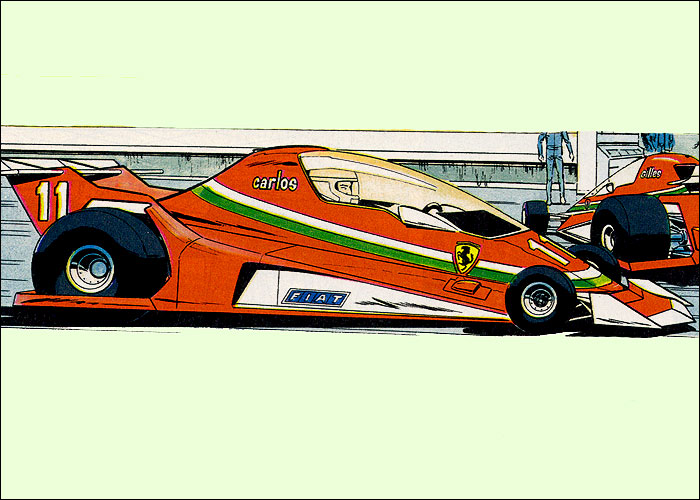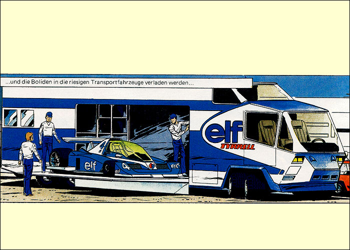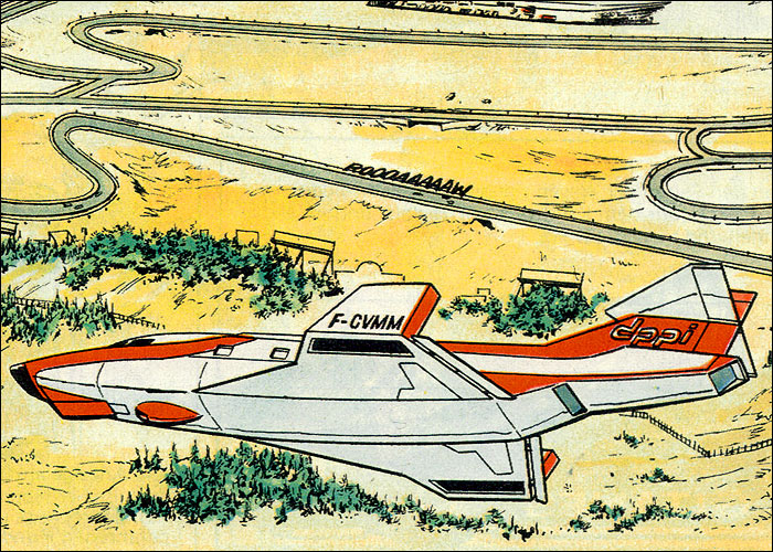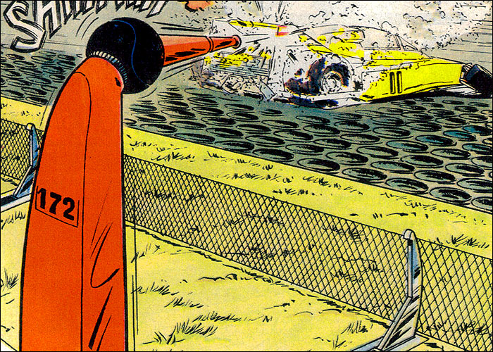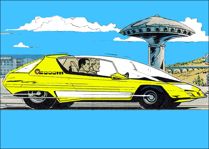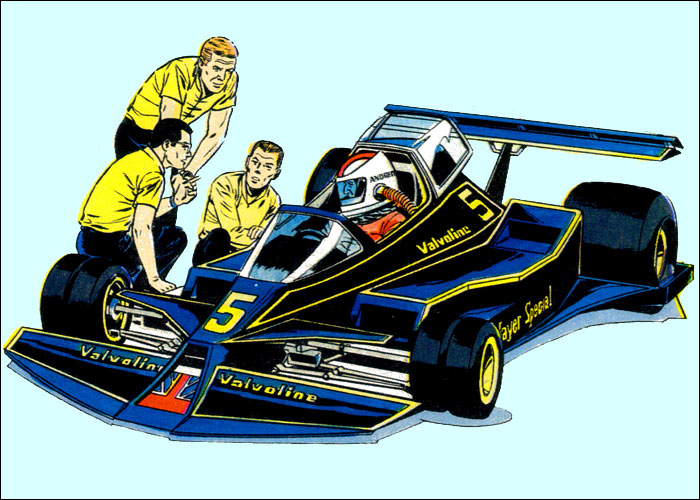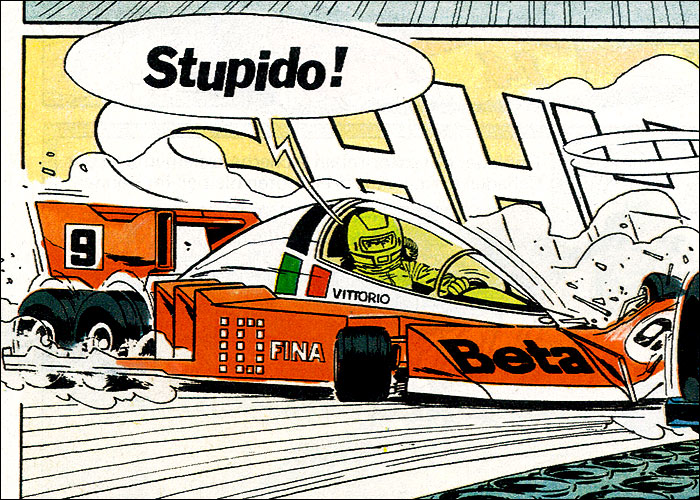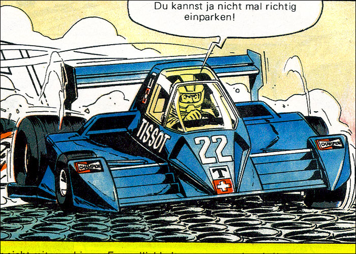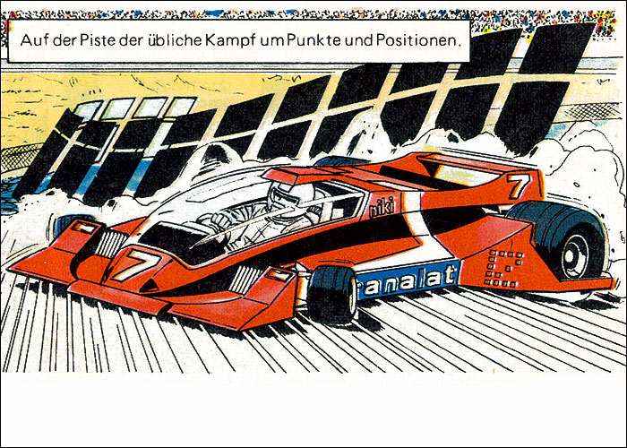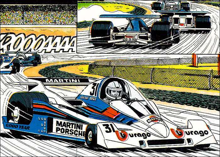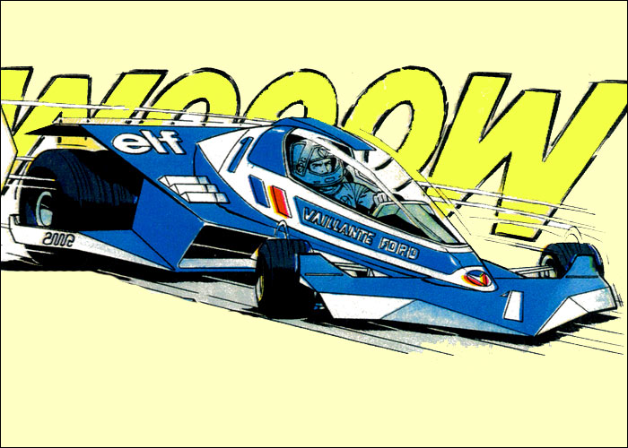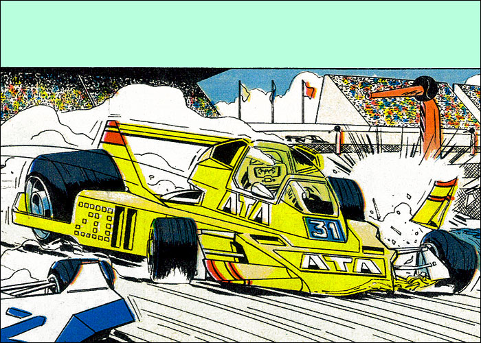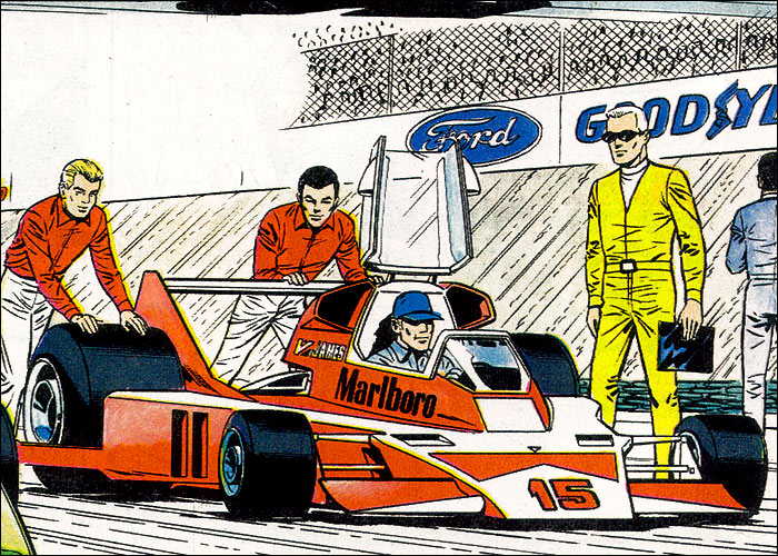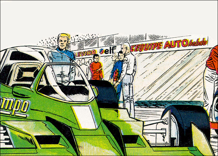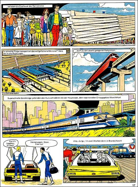 Auf der Heimfahrt von einem Grand Prix hat Michel einen Traum vom Jahr 2000: Auf dem neu erbauten, hypermodernen Montlhery-Kurs treffen sich die Formel-1-Asse der 70er Jahre im Jahr 2000 zu einem Rennen. Neu entwickelte Sicherheitssysteme sorgen dafür, dass alle Unfälle glimpflich verlaufen. Mit dieser "visonären" Kurzgeschichte (durchnumeriert von 2001-2013) liefert Jean Graton eines der ungewöhnlichsten MV-Abenteuer ab. Spaßig und spacig: die futuristische Privatkleidung von Steve und MV. (Dank an Forums-Besucher CMR für die "Entschlüsselung" einiger F1-Boliden) |