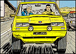 Mit diesem knallgelben Geländewagen brettern Steve und MV über die Autobahn (A44 - Schock für Steve - Der schwere Unfall von Julie Wood).