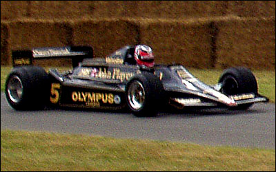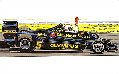 A34 - K.O. für Steve Warson (1979): Der schwarze Formel-1-Lotus wirbt für John Player Special und Olympus.