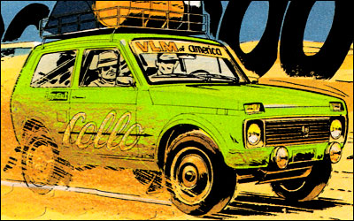 A41 - Paris-Dakar (1982): Julie Wood wird in der Sahara von einem Lada Niva attackiert.