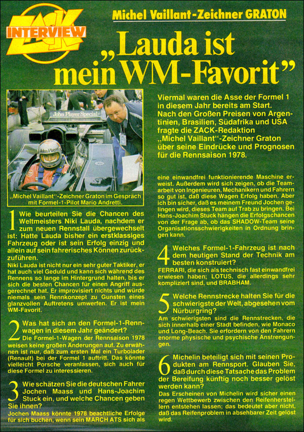 In ZACK 8/78 wurde dieses Interview mit Jean Graton abgedruckt. Graton äußerte sich hier allerdings nicht zu Michel Vaillant, sondern nur zur laufenden Formel-1-Saison. Dennoch möchte ich euch das Kleinod nicht vorenthalten.