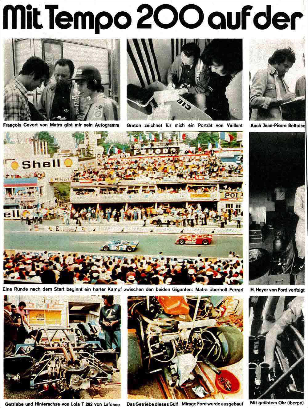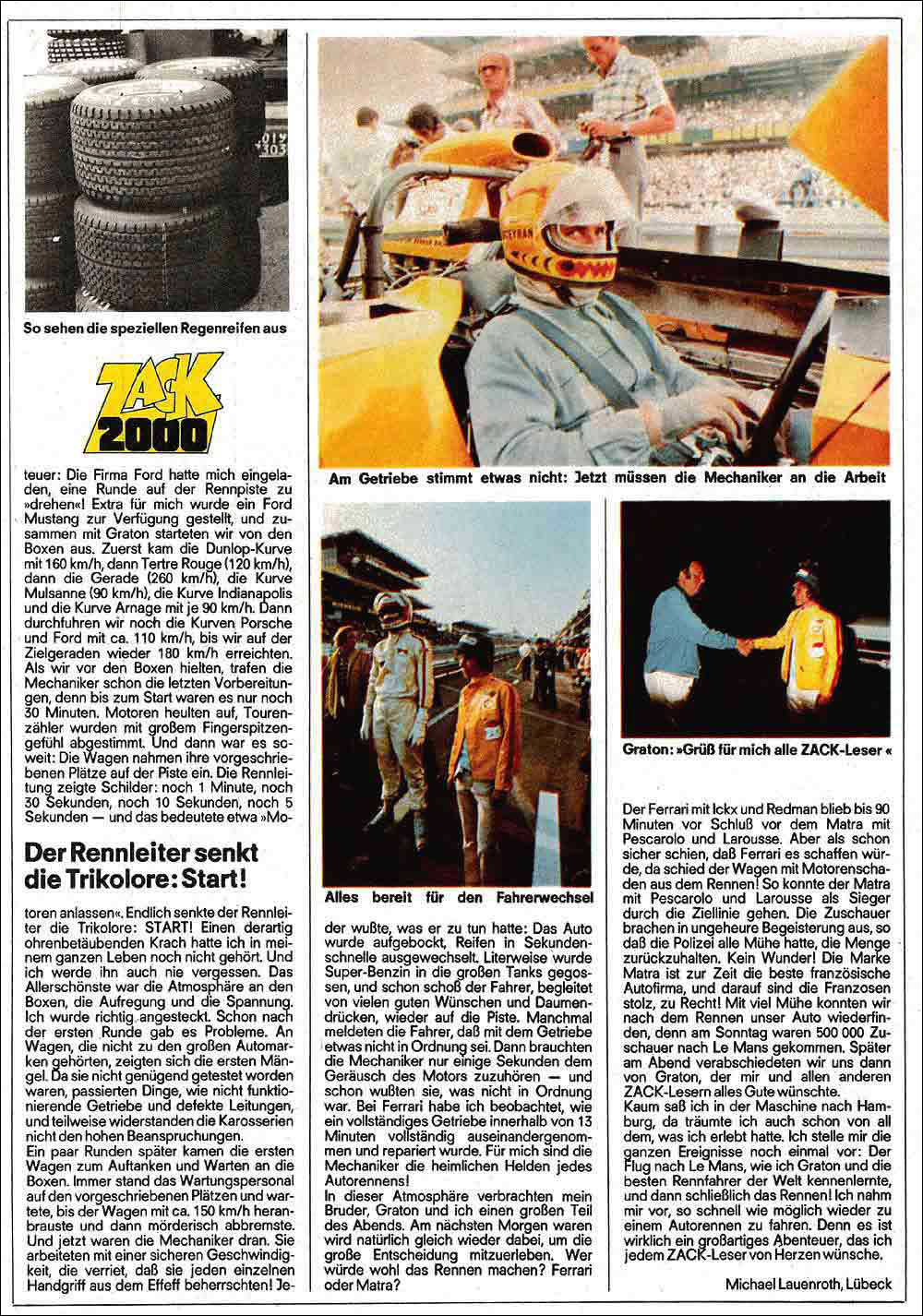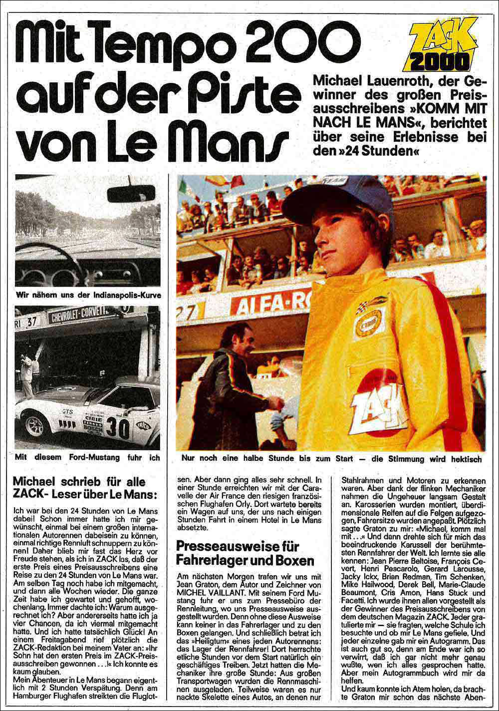 Zusammen mit Jean Graton besuchte er das legendäre 24-Stunden-Rennen und traf in der Boxengasse Fahrer wie Jean-Pierre Beltoise oder Francois Cevert (der wenige Monate danach in Warkins Glen starb). Graton kutschierte Lauenroth mit 260 Sachen um den Kurs. Michaels Abenteuer wurde im "ZACK 2000" der Ausgabe der Ausgabe 31/73 dokumentiert. Hier sind alle vier Seiten (zum Vergrößern bitte auf die Thumbnails klicken): |