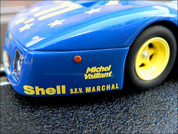 Vor den Vorderrädern befinden sich rechts und links je ein "Michel Vaillant"-Schriftzug (siehe Detailbild).