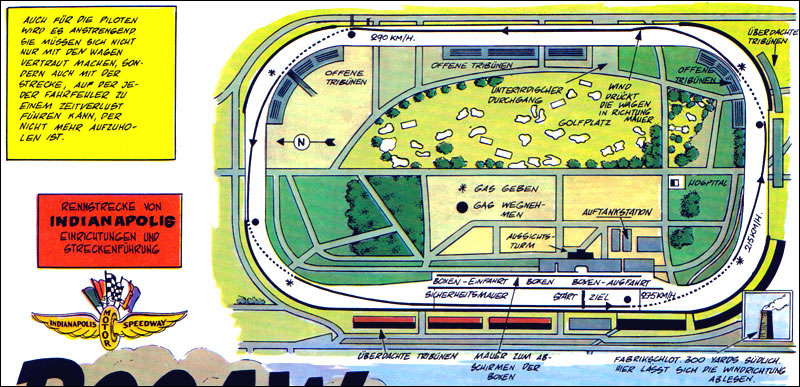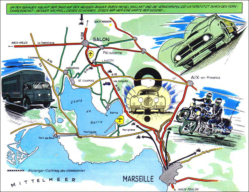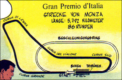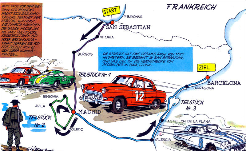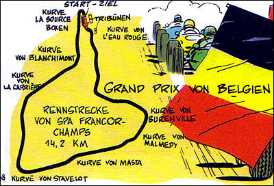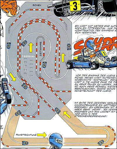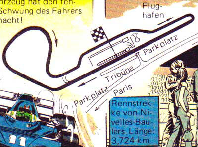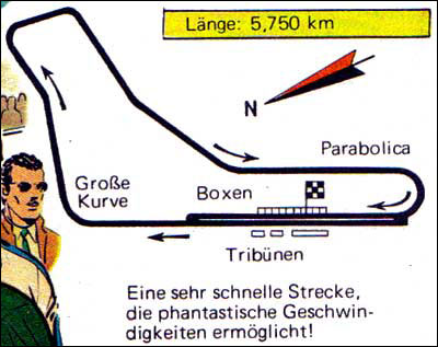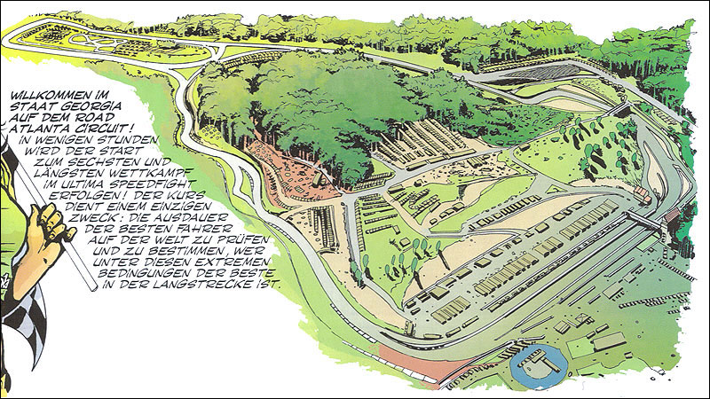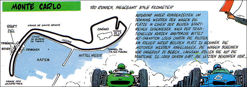 Von besonderem Reiz sind die Zeichnungen, die Jean Graton von den internationalen Rennstrecken anfertigt, auf denen MV an den Start geht. Dabei sind einige sehr schöne und detaillierte Panels entstanden. Hier findet ihr alle Rennstreckenbilder aus den in Deutschland publizierten MV-Abenteuern. Berücksichtigt sind auch Rallyekurse und ähnliche Darstellungen. (Bitte auf die Thumbnails klicken.)