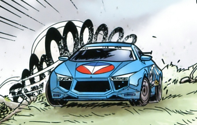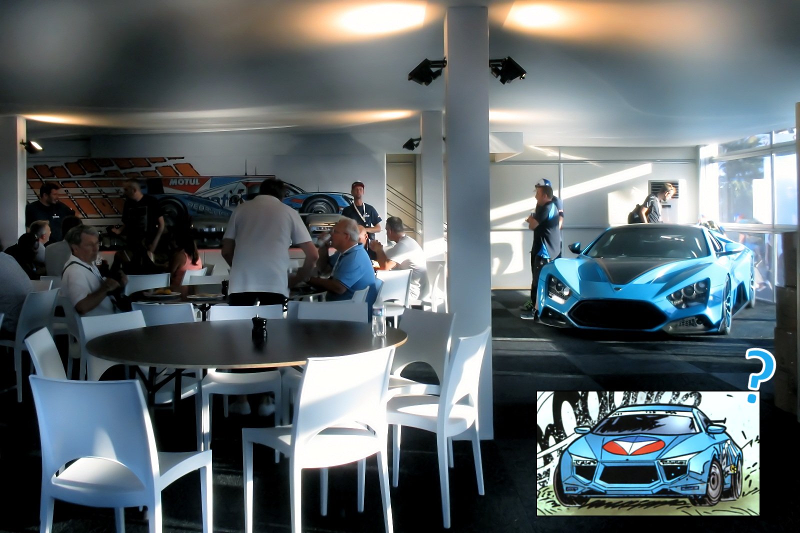 Und drinnen steht ein GT-Bolide, der tatsächlich ein Vaillante sein könnte! Erinnert er nicht ein wenig an den Cervin aus dem Album "Gefährliche Liebschaft"?