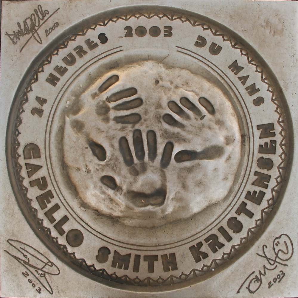 Auch Tom ist mit seinen Handabdrücken verewigt. Rund um das Denkmal sind die Abdrücke der Gesamtsieger der einzelnen Jahre im Gehweg eingelassen. Und da finden wir natürlich auch den aktuellen Mr. Le Mans.