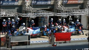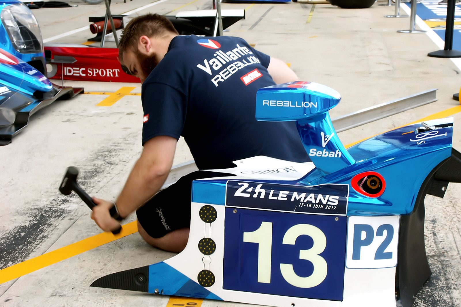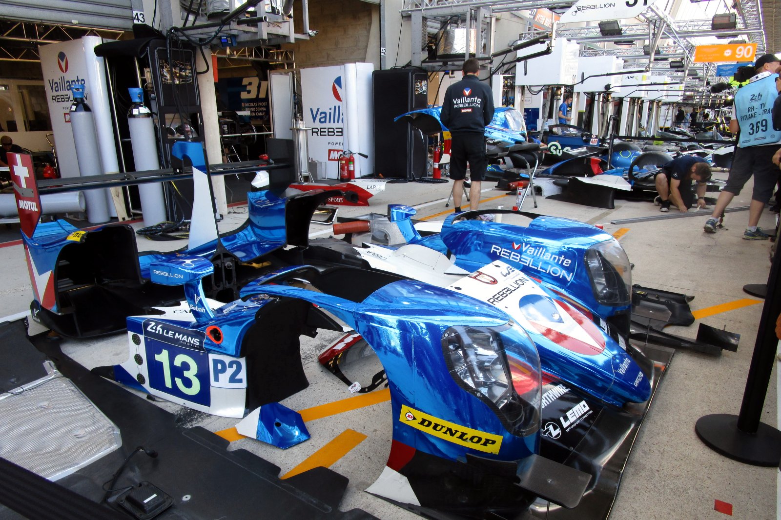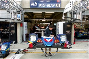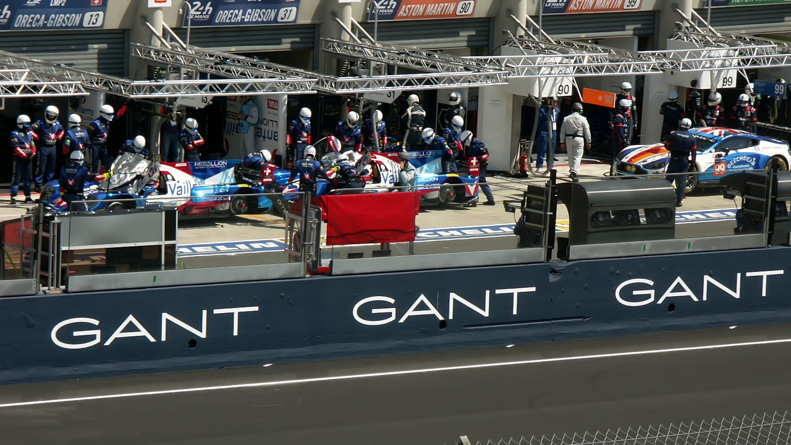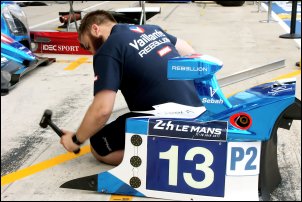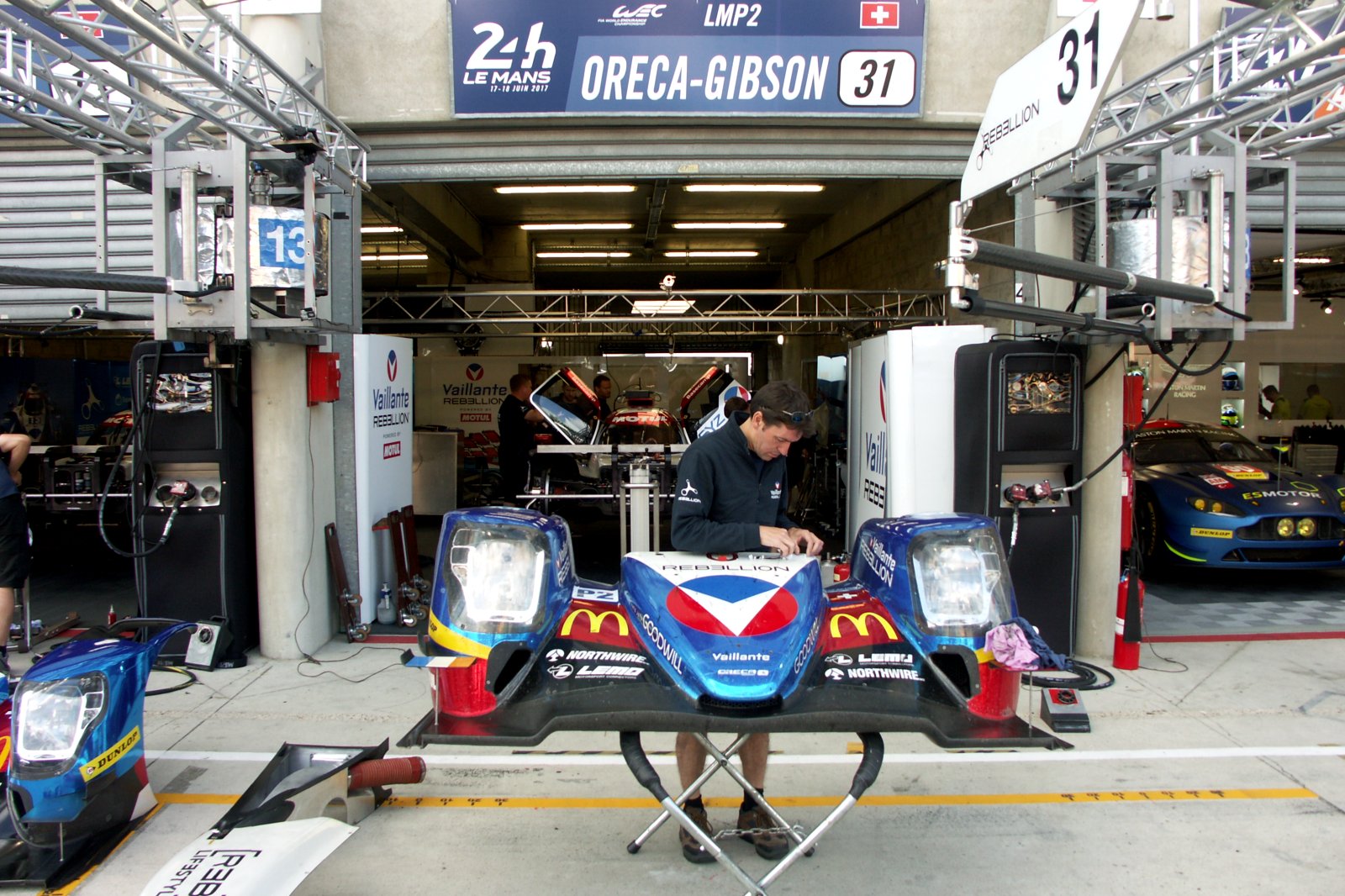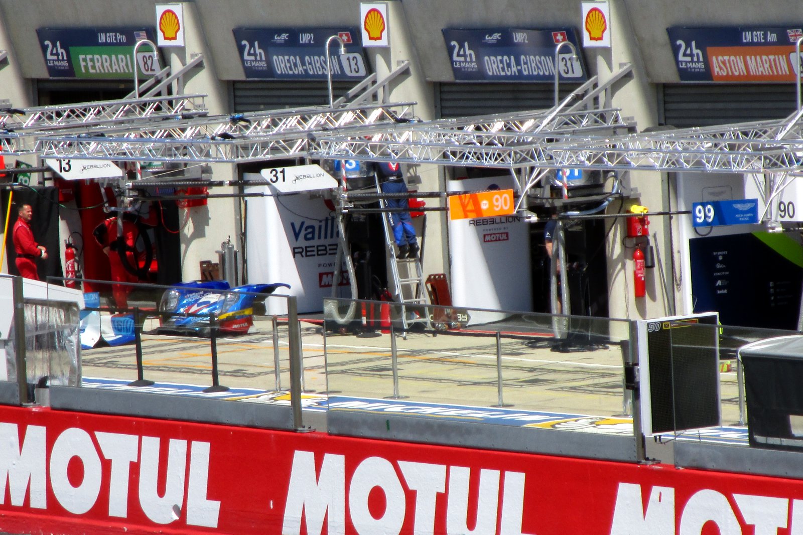 Am Mittwoch dröhnt dann endlich zum ersten Mal Motorenlärm über der Rennstrecke! Nachmittags um 16 Uhr ist es soweit. Wir nehmen unsere Plätze auf der Tribüne an der Start- und Zielgeraden ein. Bei Vaillante-Rebellion basteln sie noch an der Infrastruktur der Boxen, während der Bolide mit der Nr.31 zum ersten Mal an der Tribüne vorbeikommt!